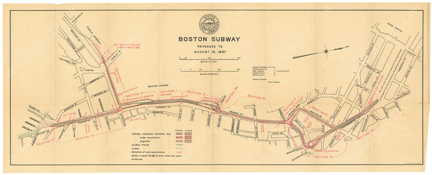 A plan showing the progress as of August 15, 1897 (a couple of weeks before its opening) is available from Boston in Transit.