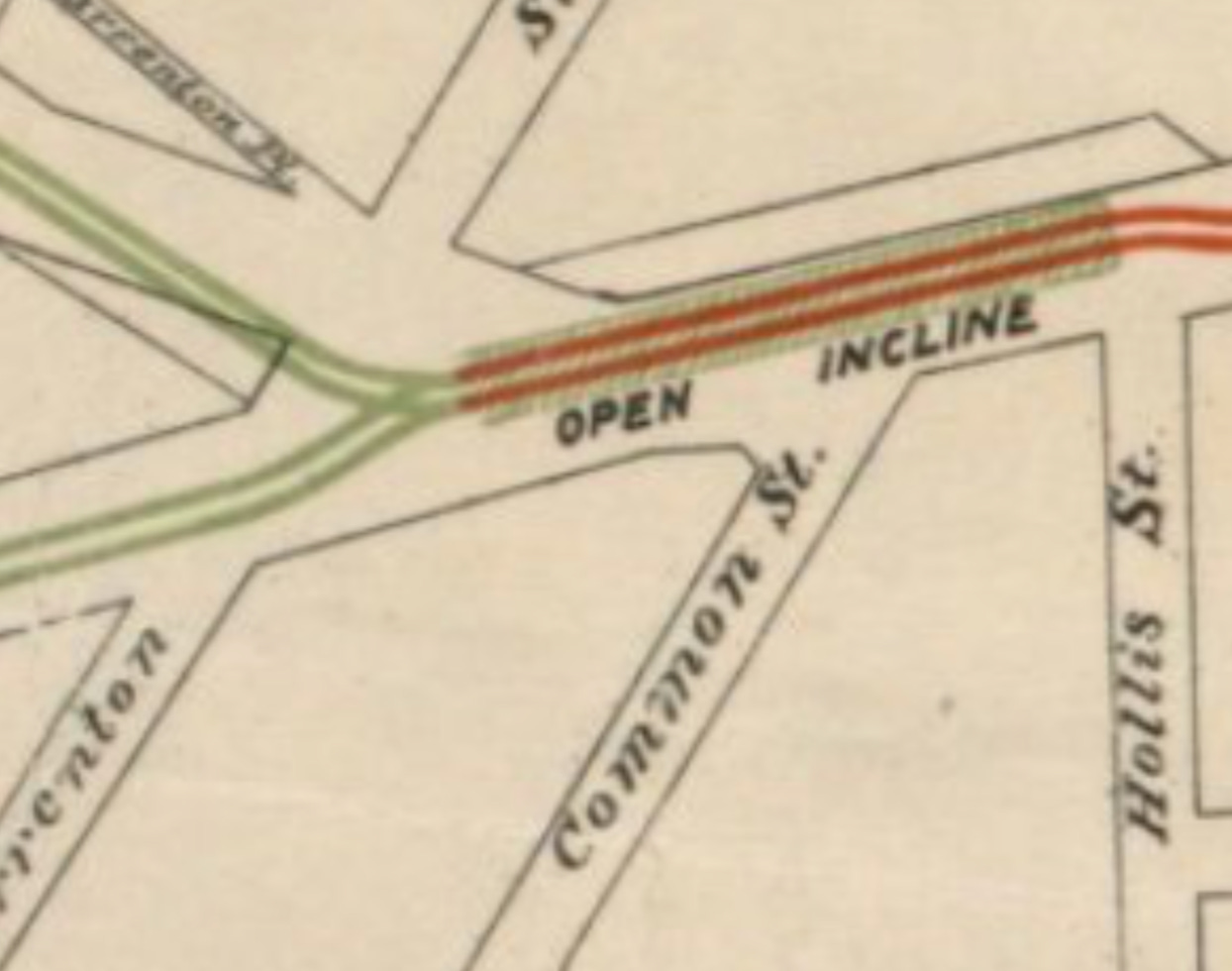This detail shows the latter of those portals, the Pleasant Street portal. Green lines indicate above ground sections while red lines are underground.