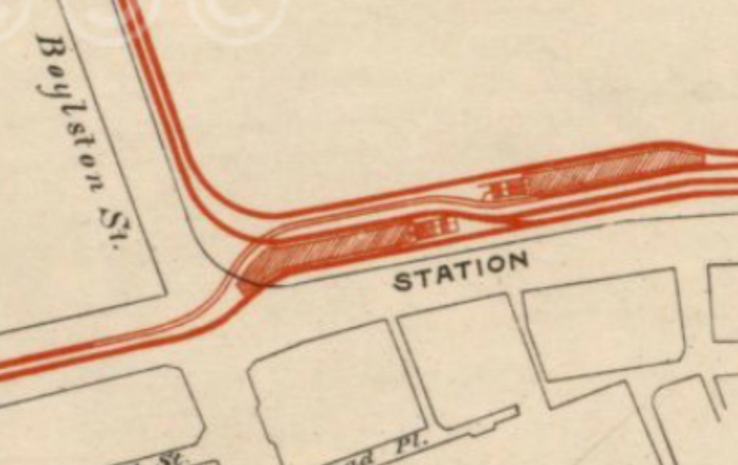 The streets in many parts of this plan are unrecognizable as they have fallen victim to various rounds of urban redevelopment. This portal was discontinued in 1962 and was buried underground. The disused tunnel still exists. Here is a detail of Boylston Station showing how the line to the south has to make its way underneath the line that curves to the west (west is up on this plan) making a sub-subway.