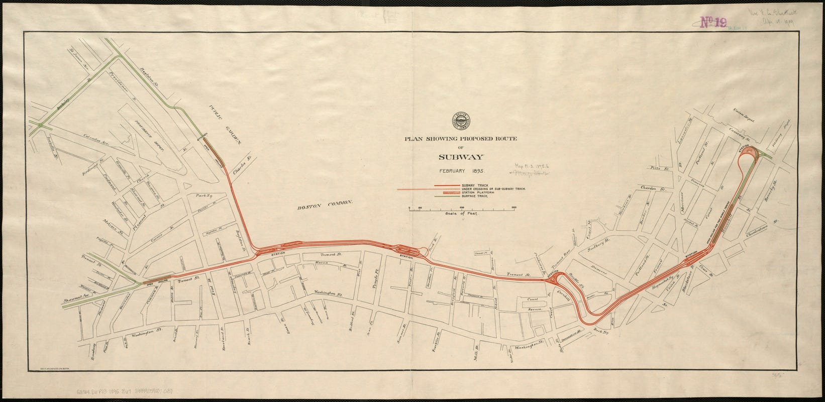 The first subway in the United States was built in Boston. The tunnel ran along Tremont Street, a chaotic mess of streetcars, horse-drawn carriages and pedestrians. The tunnel was built to route the streetcars underground to ease congestion. Here is a plan of the original subway tunnels.