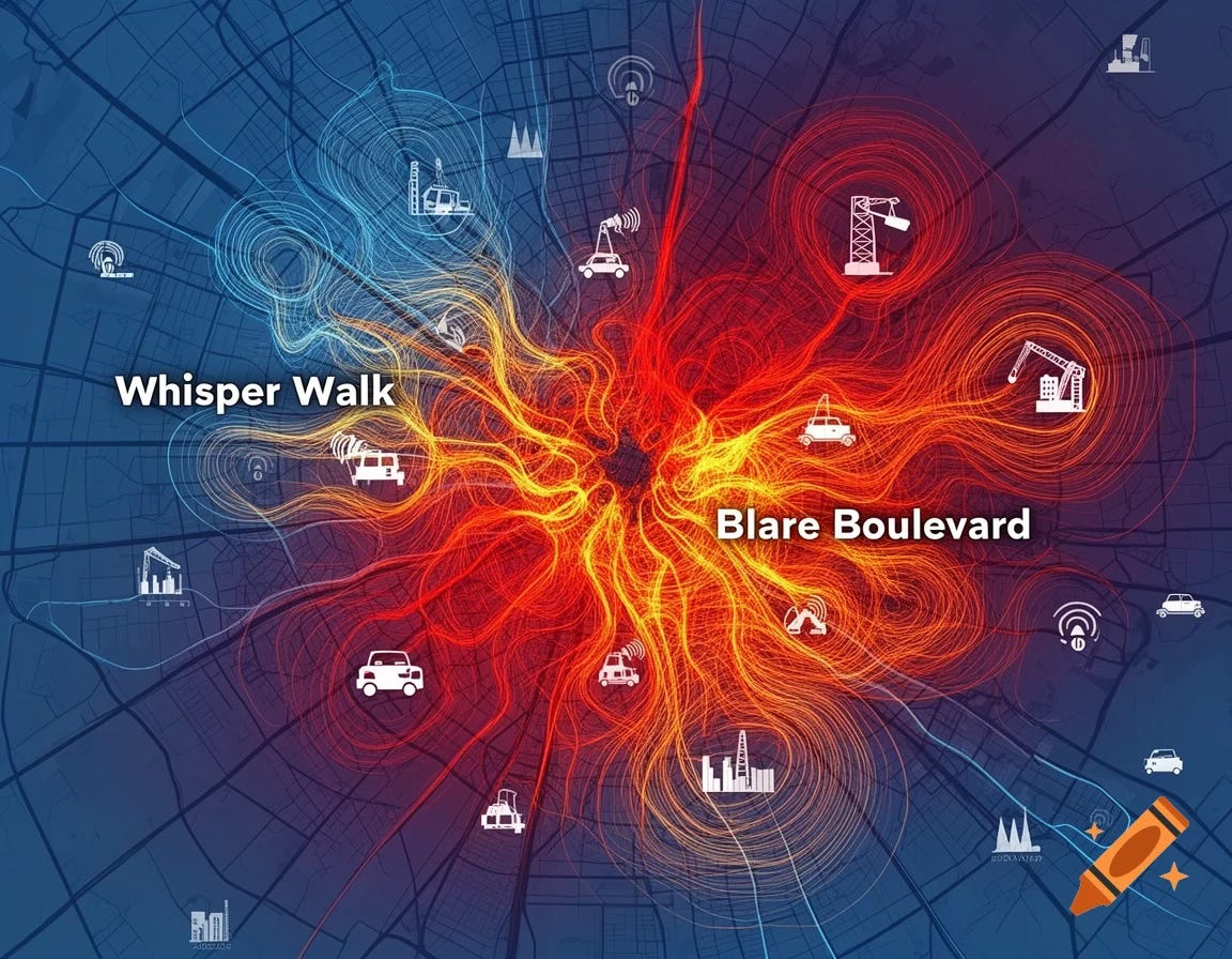 Next I decided to ask for noise pollution maps. Every time I ask Freepik, whether specifying an area or not it includes maps of China. Again, is some kind of prejudice at work? China = noise? Anyway this one is psychedelic.