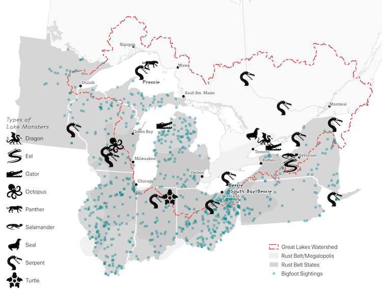 Again, not much in the way of maps I can show but I found this nice map of the cryptids (lake monsters) of the Great Lakes, via the Milwaukee Record.