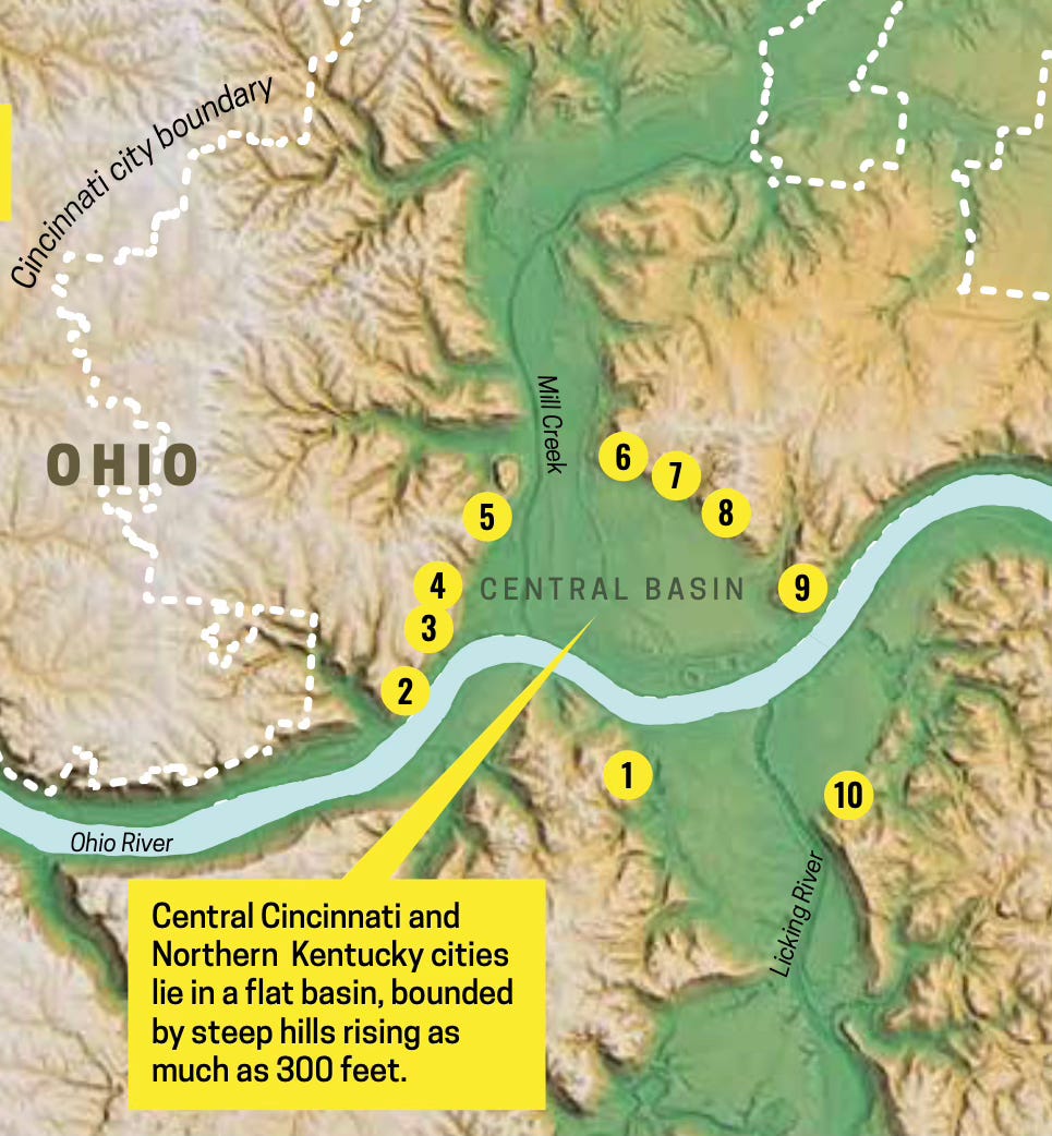 “editor Nick Swartsell and cartographer Andy Woodruff present over fifty ways of looking at the Queen City, from its early roadways and Indigenous earthworks to its shifting neighborhood borders. A visualization of relative population density can tell one story, and one showing where jobs are clustered tells another. New maps with up-to-date data sit beside historical maps that show things like exactly how communities were razed to make room for highways.“ You are invited to “find every place you can get Cincinnati chili, the location of every public stairway, and where the infamous Cincy traffic is worst.“ Here are some maps courtesy of Andy.
