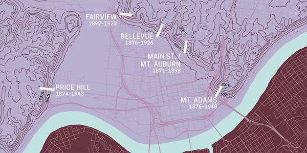 Above are the city’s inclines, and a beautiful representation of the area’s topography that gave rise to them. The numbers show hills with scenic views of the city.