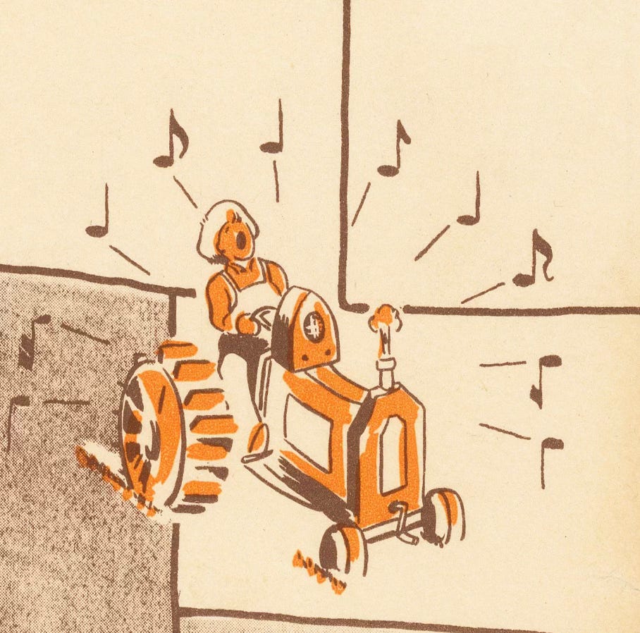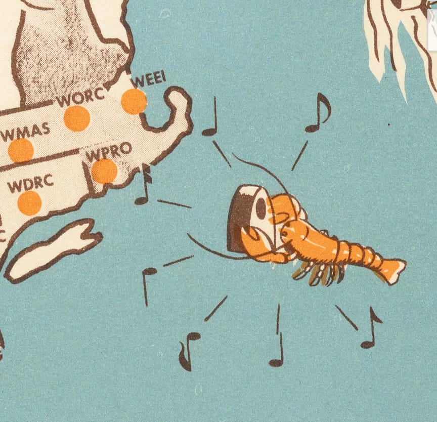 The map shows people listening to their radios (and sometimes singing along) while doing cliched activities for their regions such as driving a tractor in North Dakota,