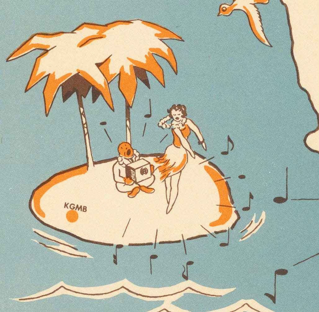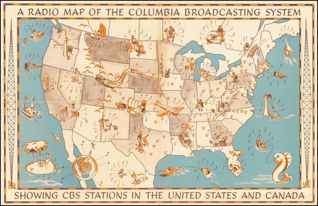 The once respected CBS network, before becoming the butt of jokes, has its beginnings as a network of radio stations under the Columbia Phonograph Company. By 1935 this network had a nationwide reach and extended into Canada. This charming map from that year illustrates and advertises its reach.