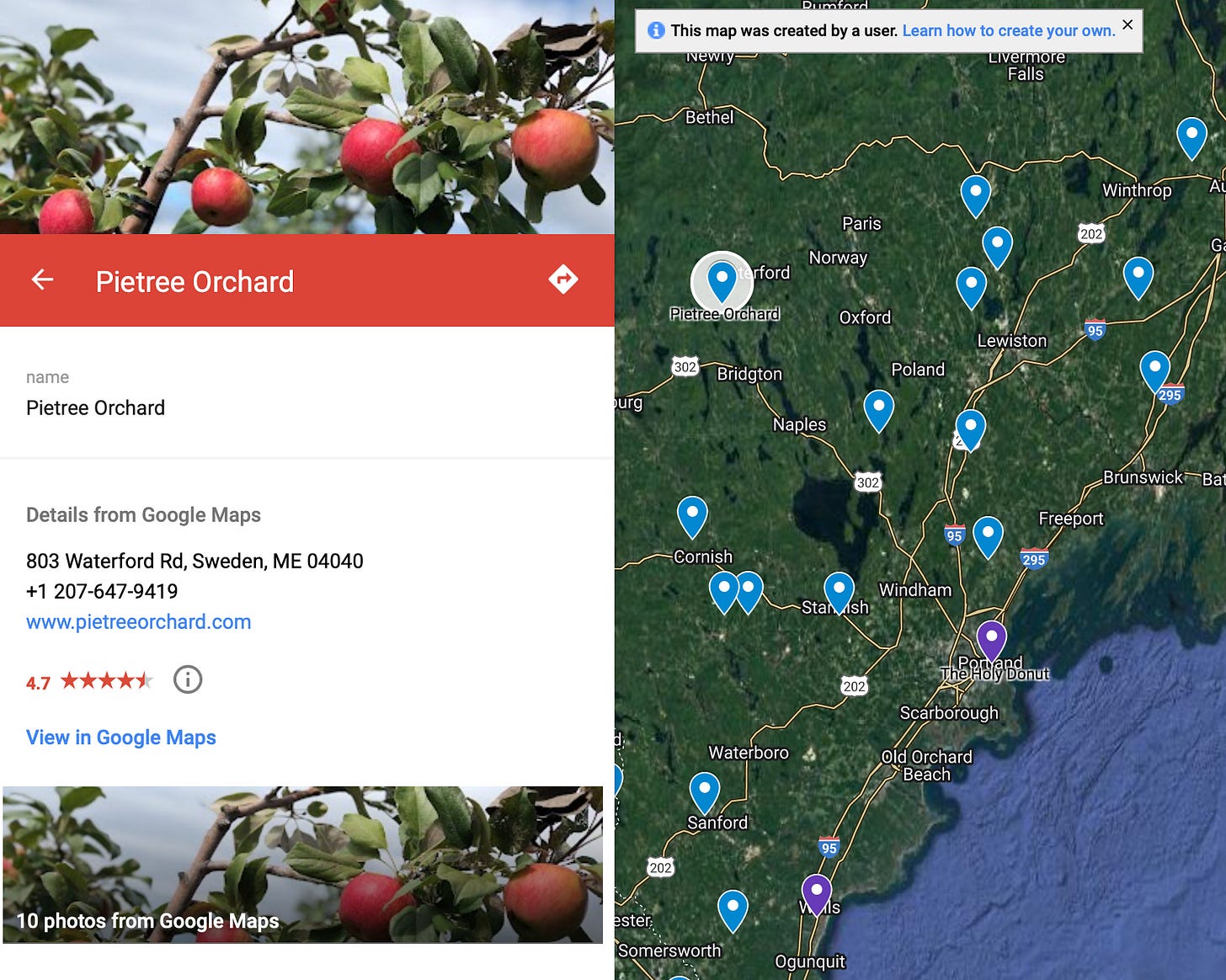 While not getting high marks for creativity, the map is impressive in its reach. Otherwise it's just another teardrop filled Google Map with the "Satellite View" (the detailed images are from airplanes) defaulted-not as easy to read as the map view IMHO. Blue represents where you can get them "fresh and hot" while purple are the pre-made ones. A click brings up the Google detailed info panel with links to reviews and their web sites.