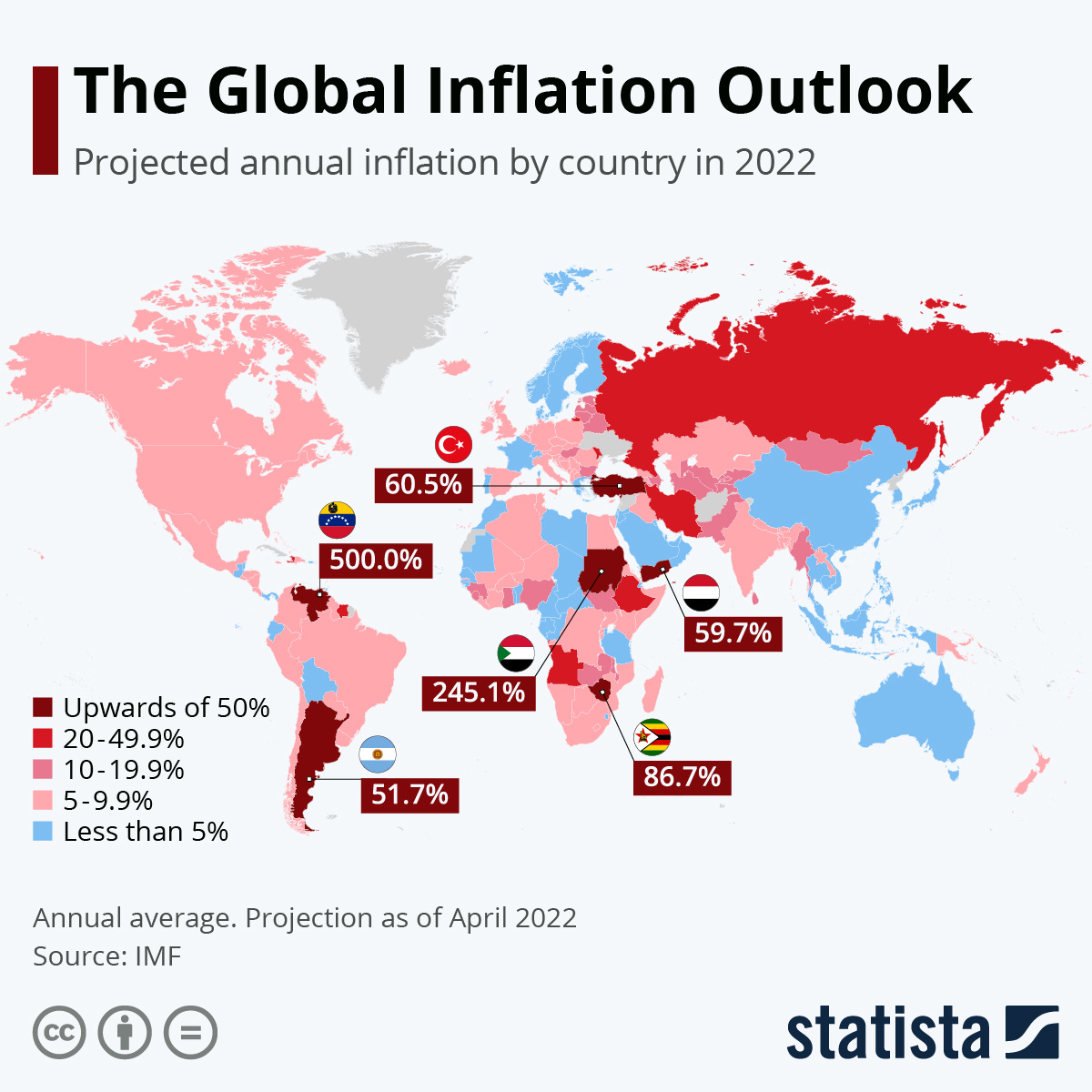 The map, via statista show projections from April, 2022. The countries with higher rates tend to be "developing nations" that are experiencing inflation as a consequence of economic growth. The highest rates are found in countries that are experiencing conflict such as Venezuela (500%*-ouch!) and Sudan. The accompanying article on statista, explains the inflation situation in much greater detail.