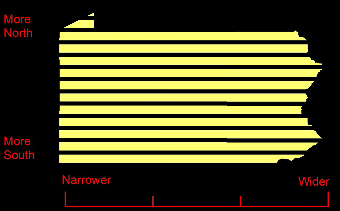 Some maps should just be shown as charts and that is the central idea of this prompt. Instead of delving into that, with limited time I recycled a jokey thing I put on Twitter years ago with a few modifications. The original tweet was about Pennsylvania’s width by longitude, here is the chart (map).