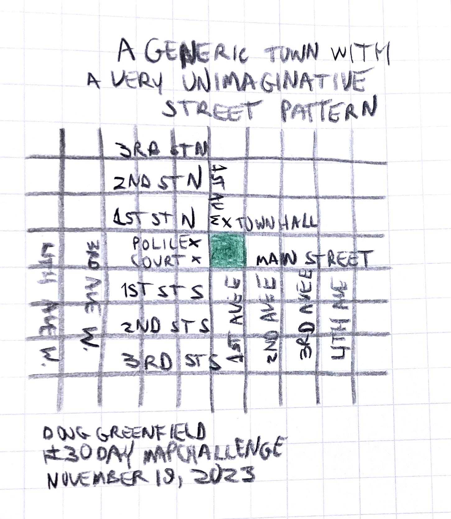 Just a quick map drawn with colored pencils on graph paper. If you look closely there’s a mistake on the west side of town!