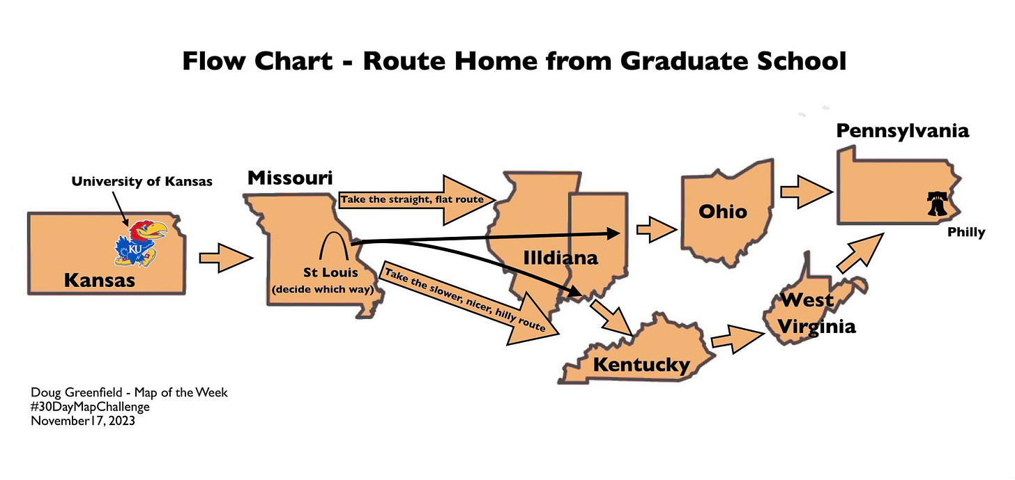 A vaguely interesting look at the trip home I had to make many times as a graduate student at the University of Kansas. Take the longer route through scenic hills or stick to the direct path through some remarkably dull, flat scenery (my opinion-some people appreciate flatness). If you get off the interstates those parts of Illinois and Indiana are probably much nicer to look at but highway blandness coupled with unremarkable terrain makes for one sleepy drive. The southern part of Indiana is quite a bit nicer to drive through as are Kentucky and West Virginia.
