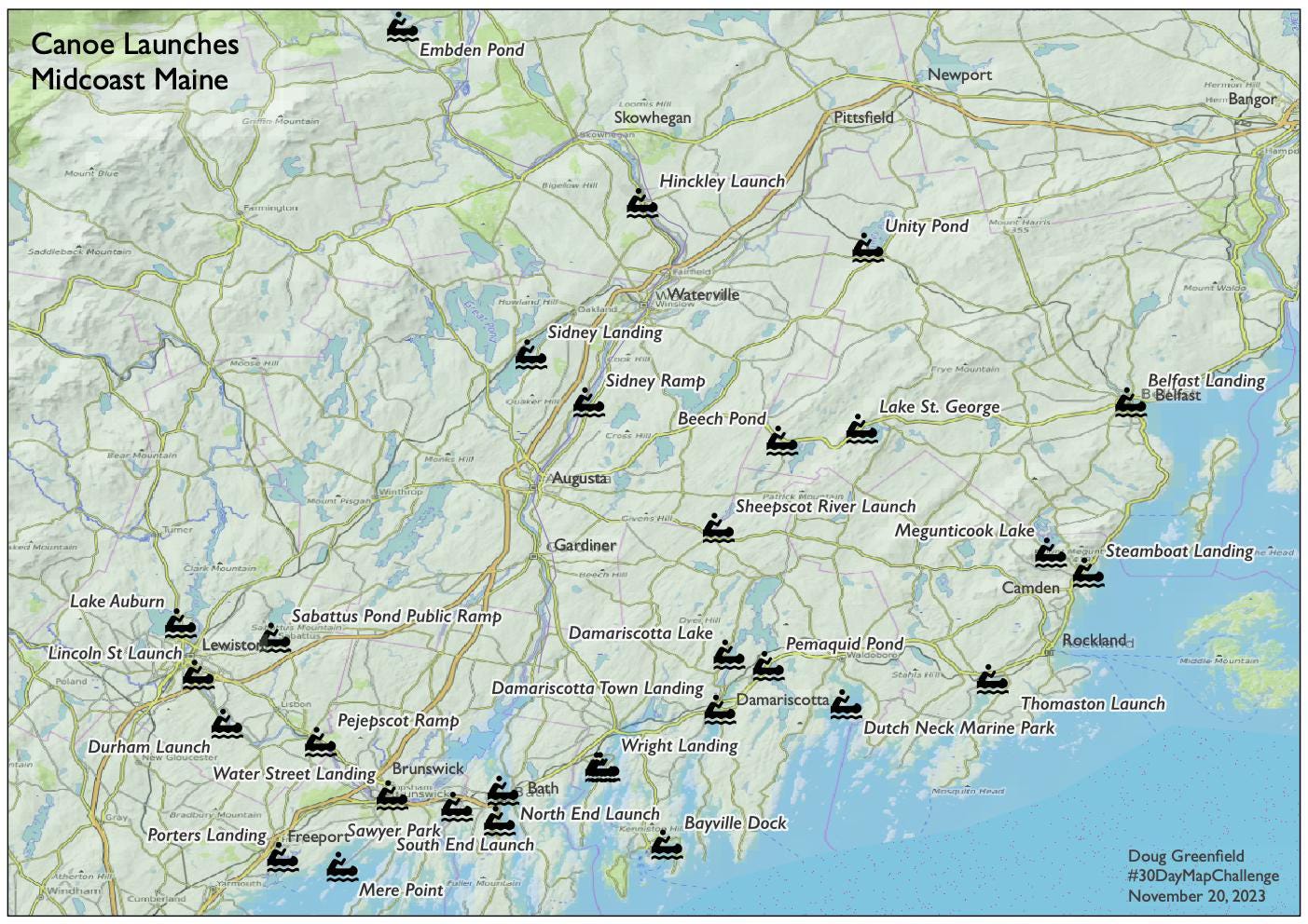 We usually spend a week or more of summer in the Midcoast region of Maine so for the outdoors theme I chose boat launches. This map might even be useful to me next summer!