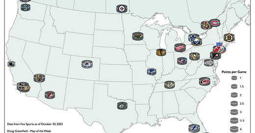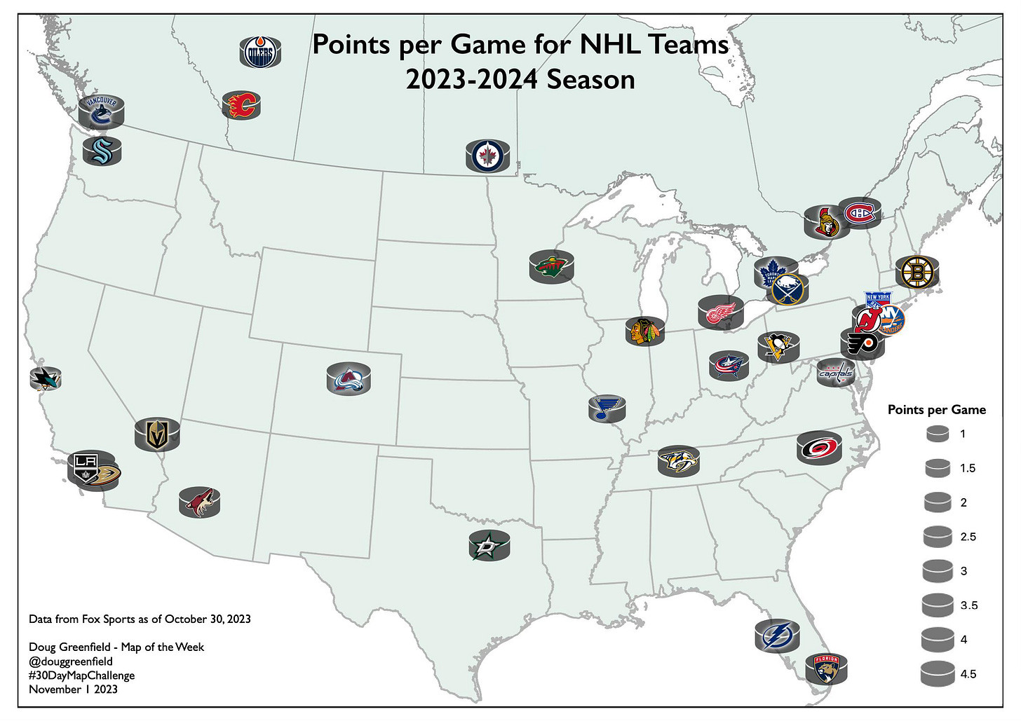 The puck sizing thing wasn’t a huge success but you get the idea. San Jose isn’t scoring much while Vancouver is. Teams have played less than 10 games so this is a very small sample size. Statistically and visually there’s not much anyone should take away from this other than me having fun with a pun and a bunch of hockey logos.