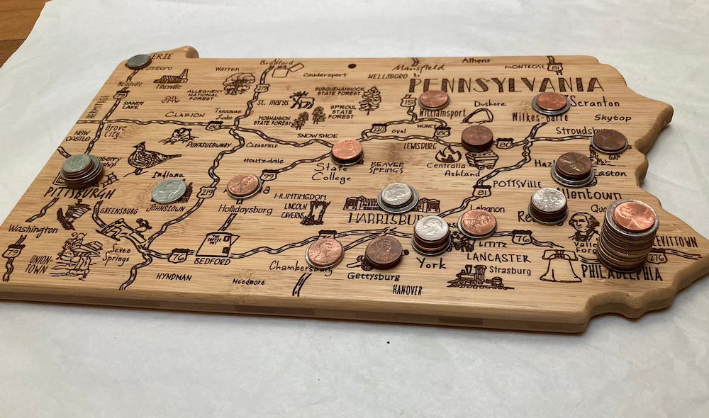 This is not exactly a hand made map, more having fun with cutting boards. My wife gave me the Pennsylvania board a few years ago and I used it in the 2021 challenge as seen here-a map of GDP by metropolitan areas.
