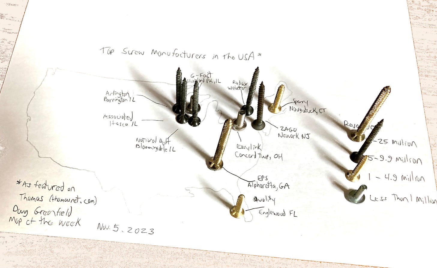 Screw manufacturers. I had an idea in at night when not sleeping about doing a map of nail manufacturers in the USA. The idea came to me because as a college intern in Albany doing local property history I found that there were many nail shops in my neighborhood. It turns out that most nails are imported now. So I did screws instead. The data source (Thomas) is biased towards their featured products but there’s contradictory info online and I needed one stable list.