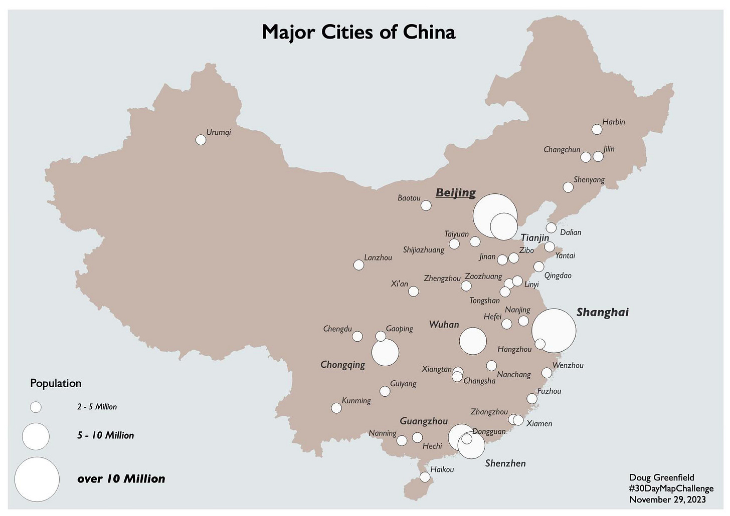 Here is a good learning experience. China has a large number of cities with populations over 2 (actually 10, keep reading) million. Most of them are unknown to people in the western world. Any one of these cities would be in the top 5 in the United States by city population. The metropolitan area populations might be more comparable but still by that measure most of these cities would be in the top 10. I realized after making this map that my population figures are out of date and there are actually 17 cities with a population over 10 million (via Wikipedia, 2021 data). Some of these cities have come close to doubling their population since the 2010 census, which is probably where the figures on this map came from. If (or when) I have the time, I should remake this map with the current figures.