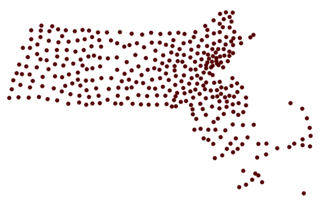Massachusetts town centroids. This was a bit of an experiment to see what drawing only the points would look like for a state with a very unique shape. Many years ago I worked for the state Commonwealth and I still had some data floating around. I don’t know about other people but this map plays tricks on my eyes. I see outlines even though there are none.