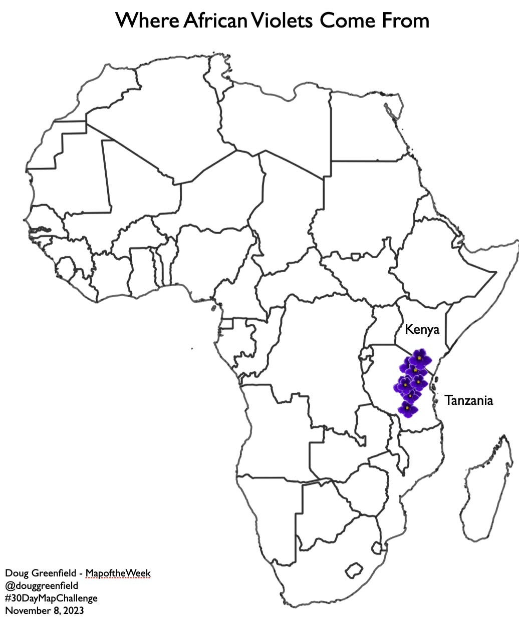 Where do African violets come from? From the Eastern Arc Mountains of Tanzania and Kenya. The version I posted on social media had a small error in the southernmost region. This version is more correct.