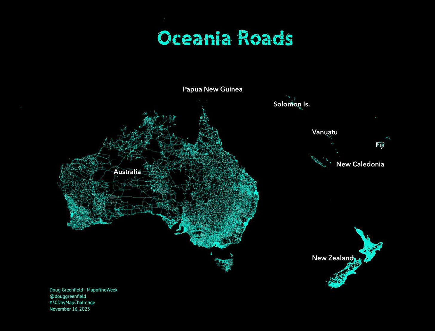 Every other continent gets a day this year so why not Oceania? Here are the roads via the Globio Roads database. I’m not sure why the network in New Zealand is so much denser than anywhere else but there it is. I like the way you get a basic population and country shape map by showing roads and nothing else.