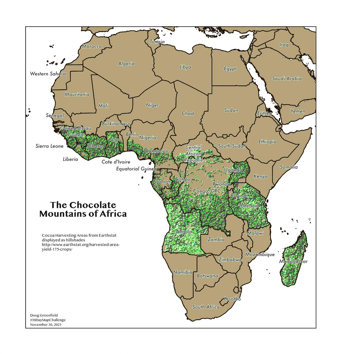These are cocoa harvesting areas from Earthstat. I used the magic of GIS to show the areas as if they are mountains and then did a little photoshopping to improve the colors. About 60% of the world’s chocolate is produced in two neighboring countries; Cote d’Ivoire (Ivory Coast) and Ghana (source). This is not well conveyed on this map unfortunately.
