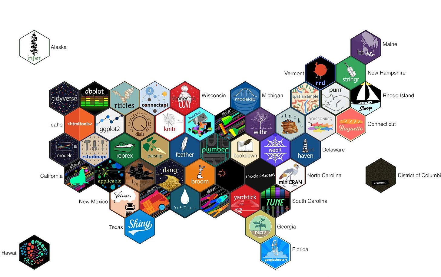 States of the US as RStudio hex stickers. Hex stickers are a cultural phenomenon among users of R software. They are for different modules (not sure if that’s the best word). I don’t know much about R and but you can make maps with it using the ggplot module (see Wyoming above). If I were a better software user I would have made this map in R but I didn’t have time to figure that out.