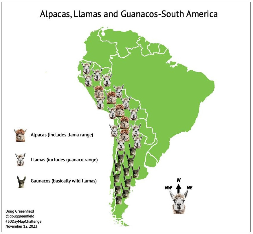These animals have overlapping ranges so I highlighted the ones with the smallest ranges. Alpacas (in the wild) live mainly in the high mountains. This map features my first ever llama north arrow.