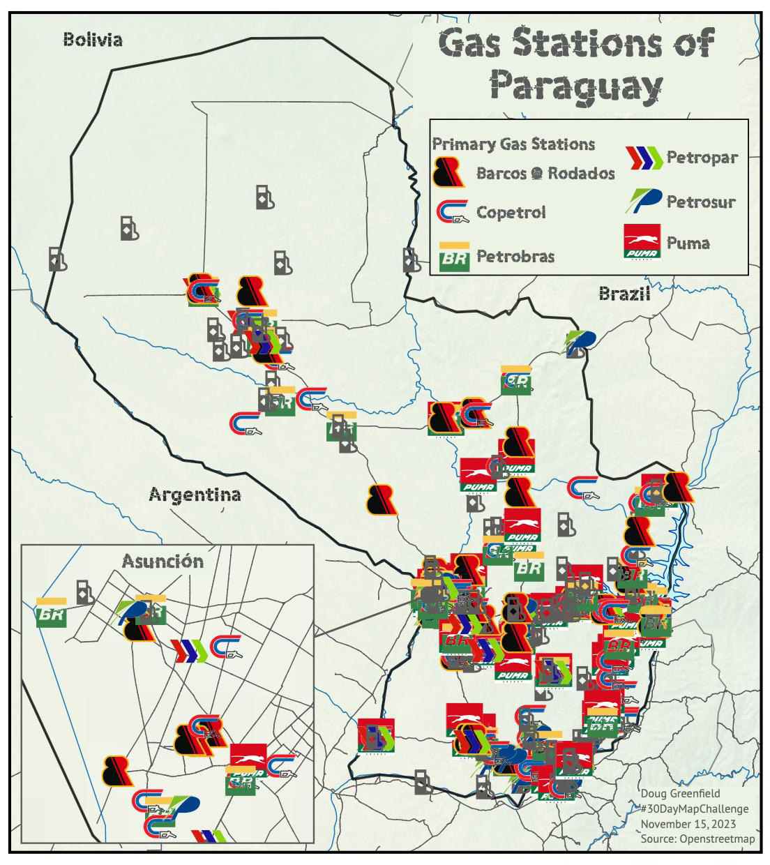 It turns out Paraguay has the most per capita gas stations of any country in South America for various reasons (source) so this map is almost unreadable. I also learned that Petropar is the country’s national oil company while Petrobras is a Brazilian company.