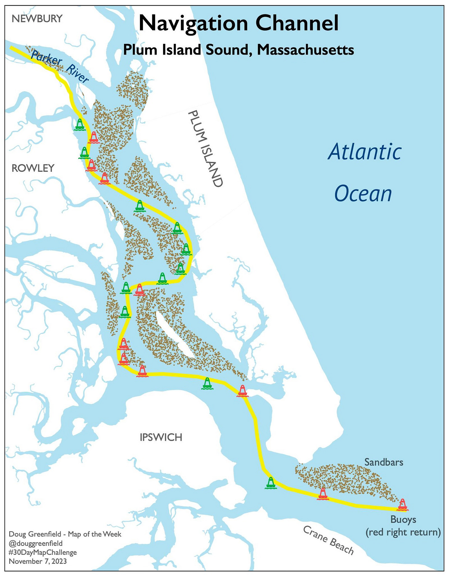 I have a friend who has organized a somewhat yearly pontoon boat ride down the Parker River in Newbury, Massachusetts and into Plum Island (really a peninsula) Sound. This year we got stuck on a sandbar. That was the inspiration for this map.