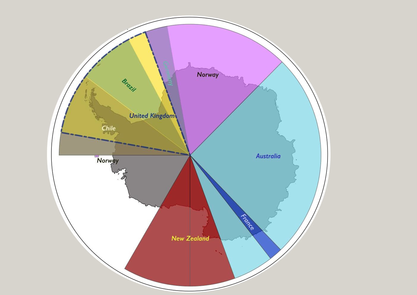 I was hoping to convey a sense of fatuousness about these claims. I outlined the UK claim in blue dashes because it overlaps with so many others. Argentina (overlapping Chile, Brazil and the UK) was accidentally deleted from the map.