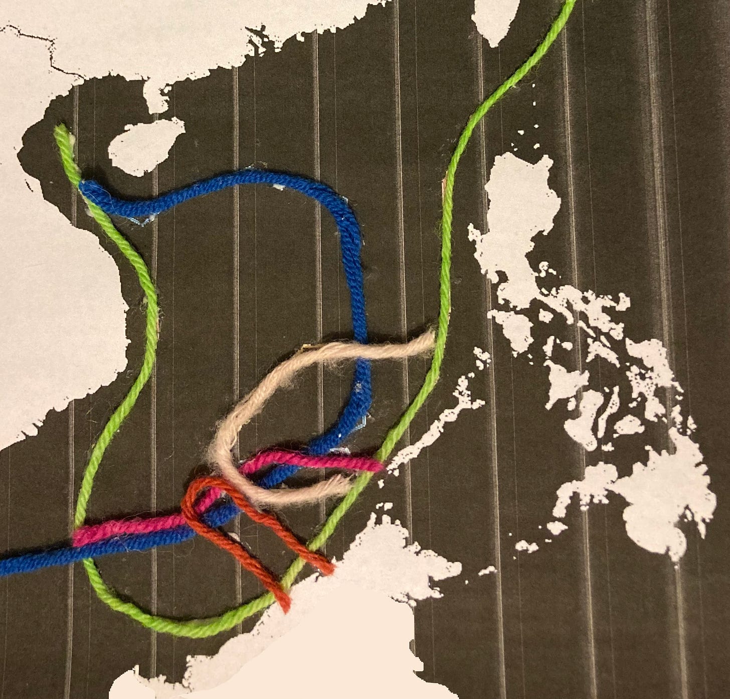 Here are the overlapping claims in the South China Sea (even the name is in dispute) from China, Philippines, Vietnam, Malaysia and Brunei-marked out in yarn.
