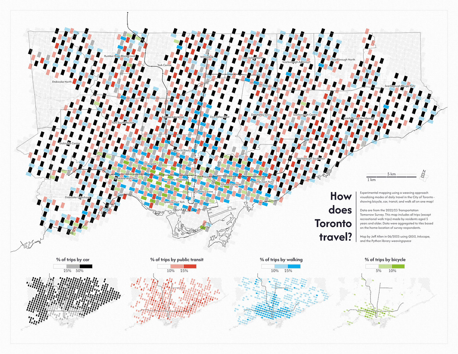 One challenge for cartographers is how to clearly show multivariate data, ie. multiple layers of data. Here Jeff Allen shows the predominant mode of travel for residents of Toronto.